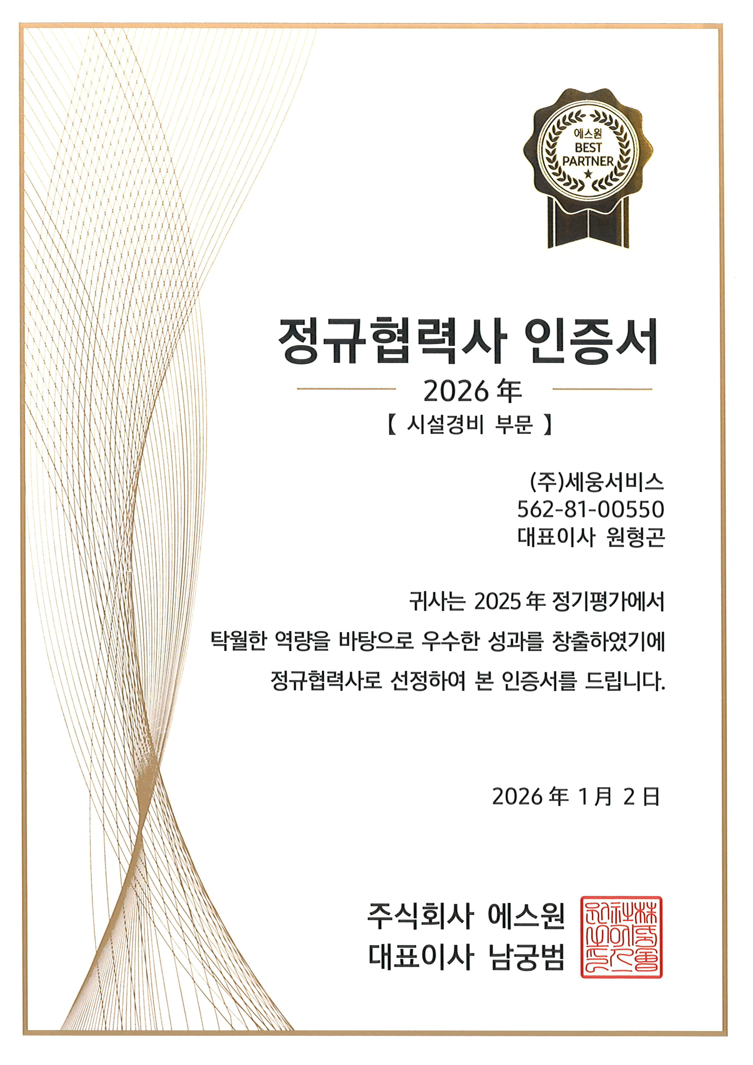 ㈜에스원 베스트 파트너사로 ㈜세웅서비스 선정
